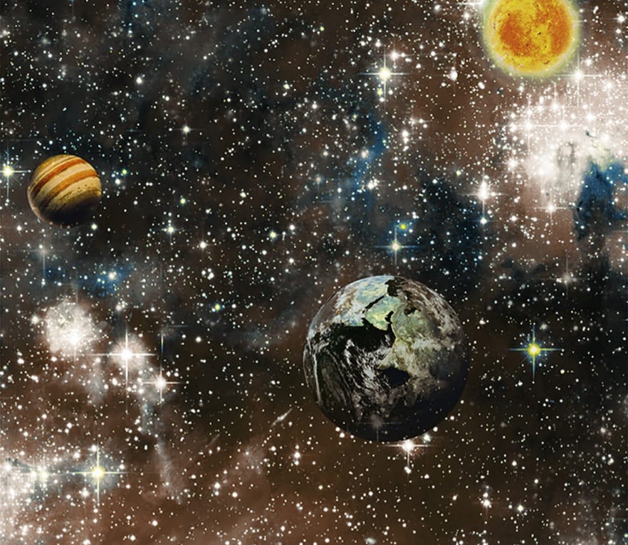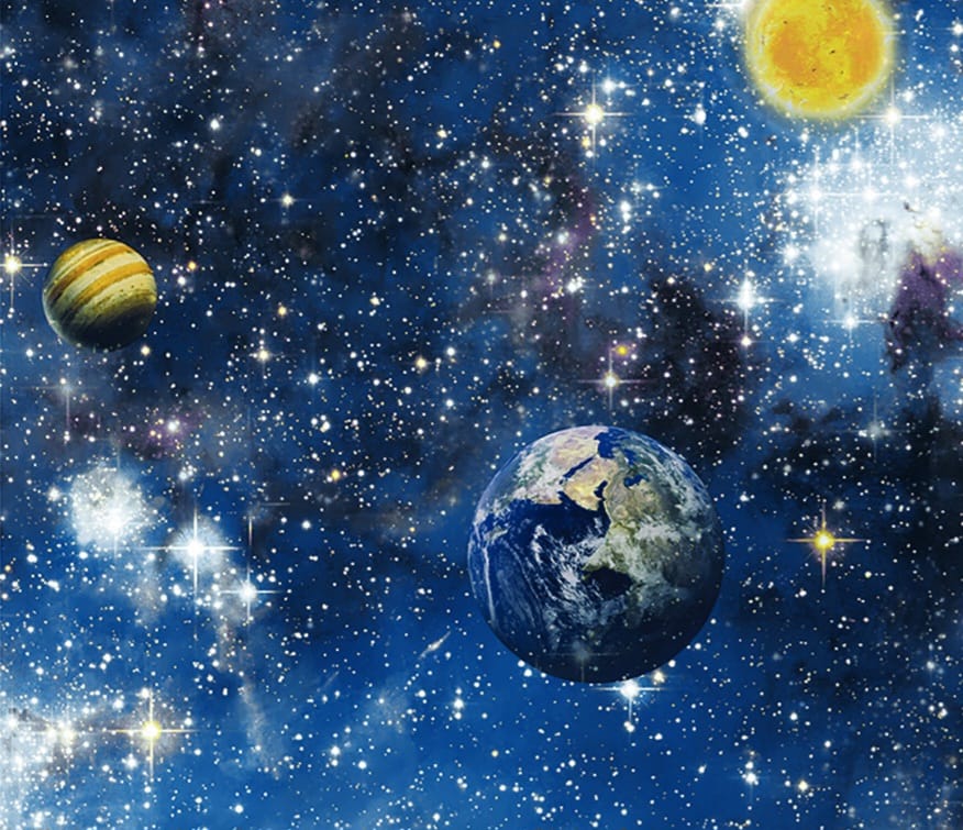 A estampa retrata o universo repleto de estrelas, constelações e nebulosas luminosas. Em destaque aparecem planetas, incluindo a Terra, além de outros corpos celestes com cores quentes e frias que criam contraste e profundidade.