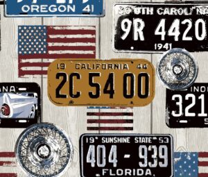 O design é composto por uma colagem de placas de carros antigas, bandeiras dos Estados Unidos e detalhes automotivos, como rodas clássicas e partes de veículos retrô.